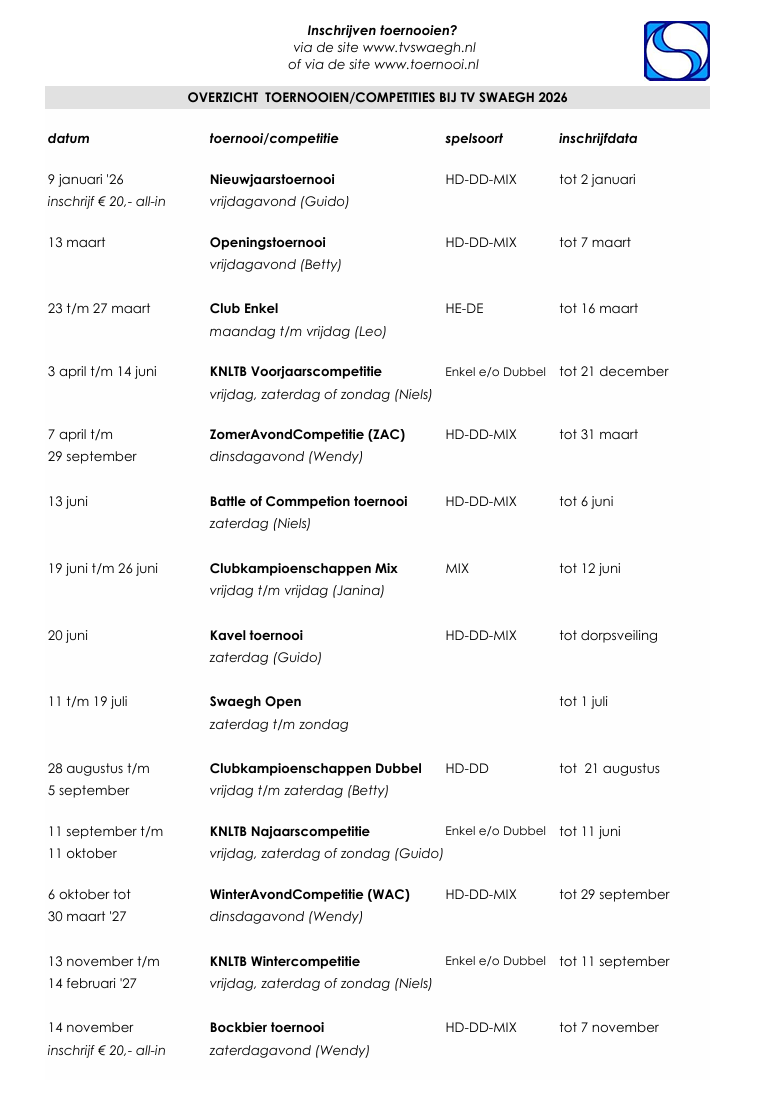 Inschrijven voor toernooien kan via deze site of www.toernooi.nl
